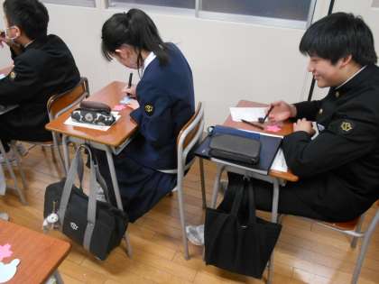 全クラス共通で、学級や学年の仲間へのメッセージを書く時間を設けました。和気あいあいとした雰囲気の中、入学してからこれまでの思いを言葉に込める姿がありました。