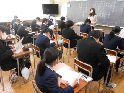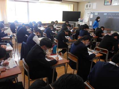 私立高校一般入試を控え、受検科目となる教科では中学校の学習を復習する時間を取ることも多くなっています。生徒たちはプリント等を使い、教員の助言も受けながらどの学級も真剣に取り組んでいました。“Practice makes perfect”ですね。