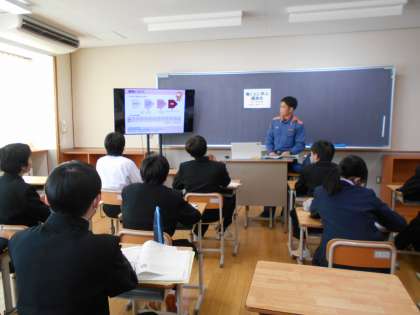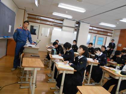 富山消防署から講師の先生をお招きし、消防士を志そうと思ったきっかけや、仕事の大変さ、やりがいなどについてお話を伺いました。