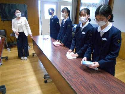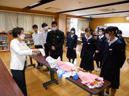 中央ケアサポートの様子です。介護福祉の仕事を始められた経緯やそのやりがいについて話され、その中で思いやりの心を育てることが大切だと言われました。衣類をたたむ実習もあり、生徒は丁寧にたたんでいました。