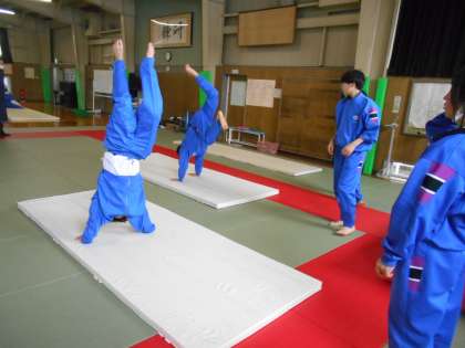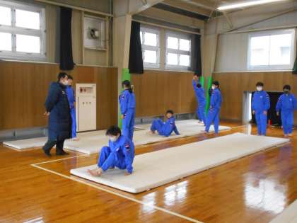 保健体育の授業では、マット運動に取り組みました。練習内容を6グループに分け、それぞれの課題をクリアできるように頑張りました。