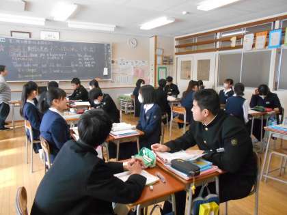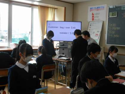 英語の授業では、買い物の場面での会話練習をしました。Shall I 〜?がポイントでした。