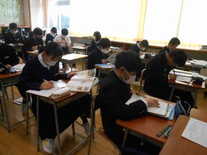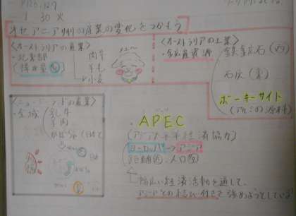 社会の授業ではオセアニア州の産業の変化について勉強しました。後半には、各自で資料集やChromebookを使って自主的に調べてたことを、ノートに分かりやすくまとめていました。