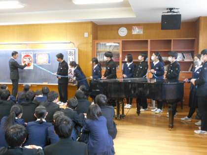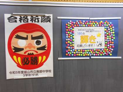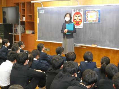 最後に、合格を祈願して、高木先生と学年生徒会のメンバーでだるまに目を入れました。教室に戻ってから手作りのお守りを受け取りました。明日は、これまでの努力の成果を精一杯発揮してきてほしいと思います。