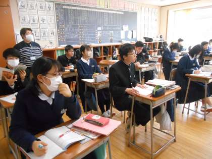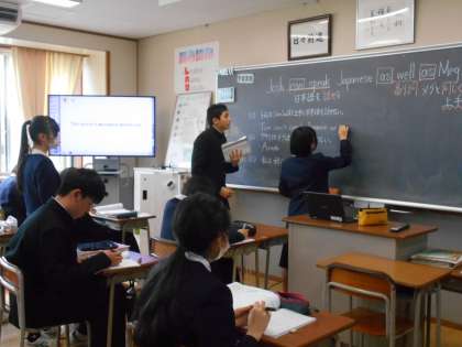 英語の授業では、asを使った同級について勉強しており、解いた問題を黒板に書いて、みんなで共有する様子も見られました。