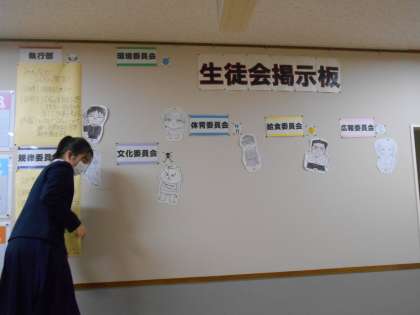 生徒玄関エコスペースには、絵が上手な人に依頼した、委員長や執行部メンバーの似顔絵が登場しました。協力してくれたみなさんありがとう。とってもすてきなコーナーになりました。