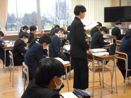 国語の授業では、「君は『最後の晩餐』を知っているか」を読んで、段落ごとに序論、本論、結論に分けて文章の構成と概要を捉えていきました。