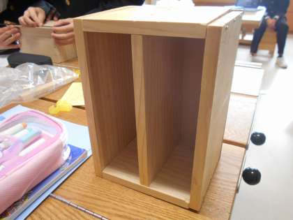 技術の授業で制作している木製本立てです。自分が持っているDVDの大きさに合わせた人や持ち手を作って移動させやすくした人もおり、一人一人の工夫が見られる物になりました。