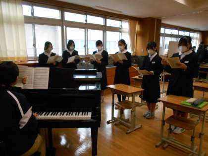 音楽の授業では、卒業式で歌う曲を練習しています。各パートの音取りからスタートです。