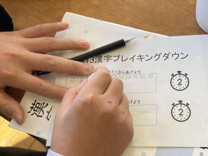 お題の漢字がつく二字熟語を時間内にできるだけ多く書き出す「漢字ブレイキングダウン」が本日と木曜日に行われます。楽しみながら学ぶ姿がたくさん見られました。
