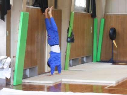 他のクラスの保健体育でのクラスもマット運動の様子です。倒立は、一旦停止していないと合格しないとのことですが、何回もトライをして合格を勝ち取っていました。すごい!