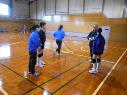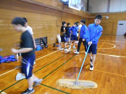 男子バドミントン部とバレーボール部の後片付けの様子です。丁寧にモップをかけて終了です。