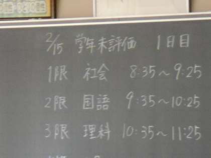 3年生は、1、2年より早く、今日から学年末評価が始まりました。今日は、社会、国語、理科の3教科に取り組みました。
