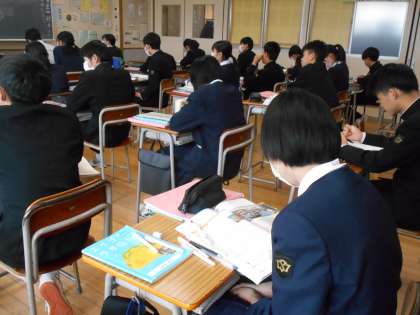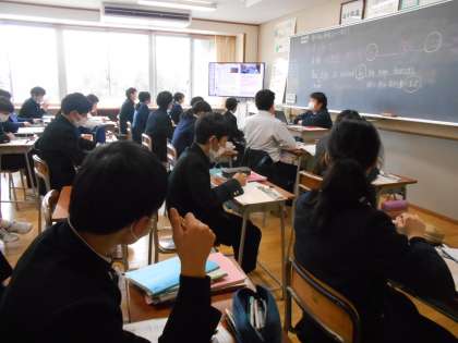 英語の授業では、本文の内容理解を進めながら、受け身の復習をしました。実際の使い方をイメージできたのではないでしょうか。