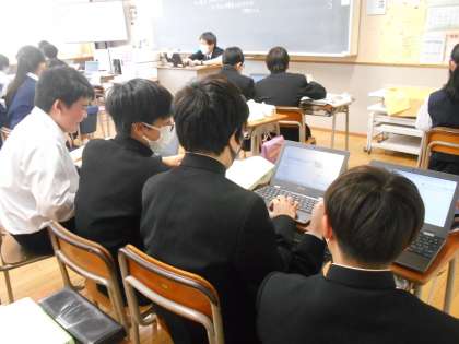 家庭科の授業では、栄養素の勉強をしました。どんな材料を使うとバランスのよい食事になるか、仲間の考えも参考にしながら進めていました。