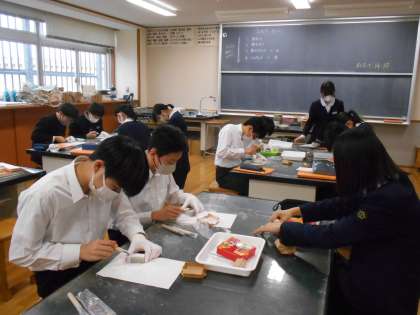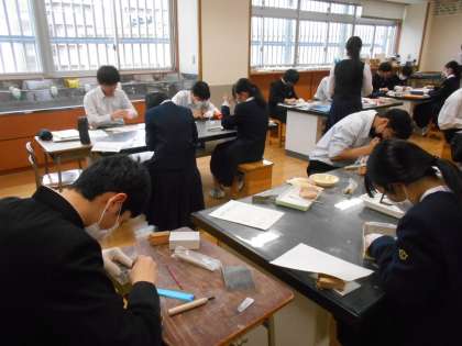 美術の授業では、篆刻の制作も中盤です。完成して、試しに押してみた人もいました。思い通りにできていたでしょうか。