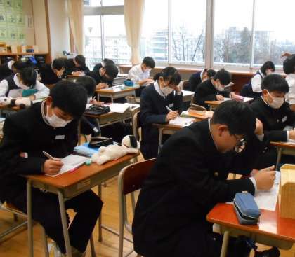 数学の授業では、容器に残った水の体積を求める方法や円錐の表面積の求める方法等、これまでの復習をしました。
