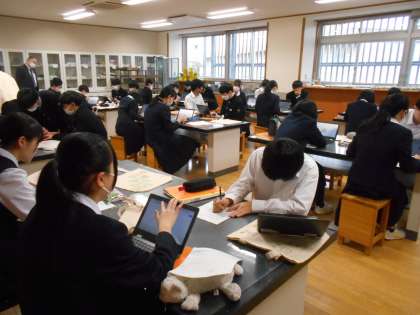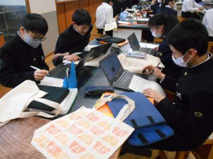 美術の授業では、ゴムはんこでプリントしたバックについて、工夫した点等をスライドにまとめ発表する準備をしました。