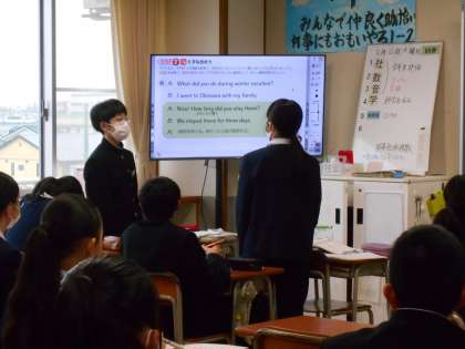 英語の授業では、いろいろな疑問詞を使って尋ね合うことにチャレンジしました。長く会話するにはどのようにつないでいくとよいのかがポイントです。
