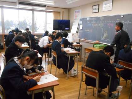 数学の授業では、資料の整理の仕方について勉強しました。途中、意見交換をしながら、理解を深めていました。