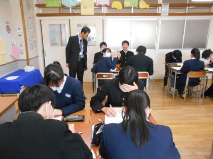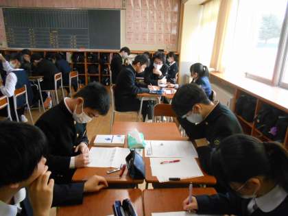 数学の授業では、グループの形で練習問題に取り組み、つまずいたときには助け合っています。県立一般入試までもう一週間、励まし合いながら乗り切りましょう。