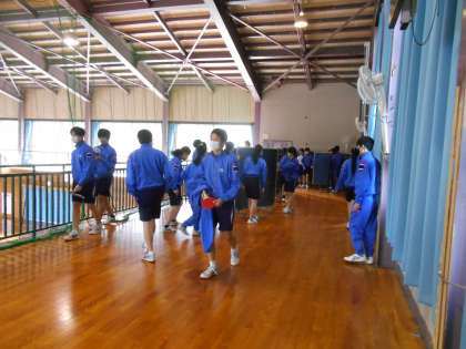 保健体育の授業では、卓球に取り組みました。他学年がフロアを使っていたので、ギャラリーを使って活動しました。