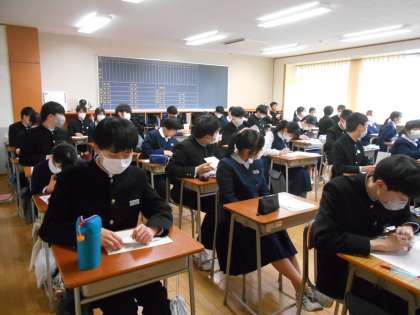 英語の授業では、ワークシートを使って、今日も練習問題に取り組みました。自己採点は厳しくするとよいですね。