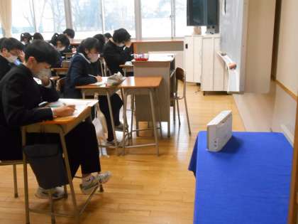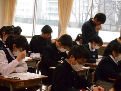 英語の授業では、リスニング問題に取り組んでいるところでした。落ち着いて聞き、メモを取るようにしましょう。