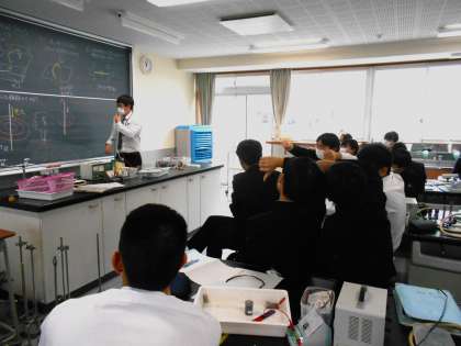 理科の授業では、電流がもっている電気以外の特徴を調べました。また、右手を使って電流が流れる方向を知る方法を教えてもらい、便利だという声が上がっていました。