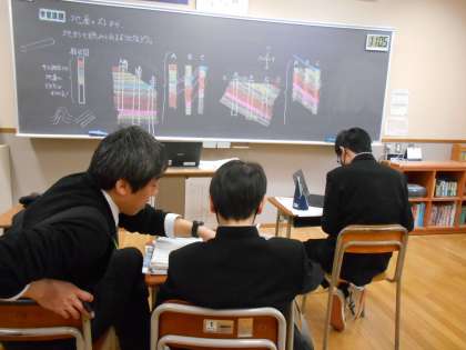 理科の授業では、地層について勉強していました。色分けした地層を見て、地層のずれから地形を読み取ることに取り組んでいました。