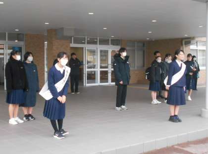 3月7日に行う来年度前期生徒会役員選挙まで、毎朝選挙活動を行います。会長、副会長それぞれの立候補者が、選挙管理委員が見守る中、朝の挨拶をしながら、元気に投票を呼びかけました。選挙当日まで、みなさんのやる気をしっかり伝えましょう。