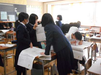 社会の授業では、富山市の地図を使った地理の授業が始まります。大きな地図を食い入るように見ていました。