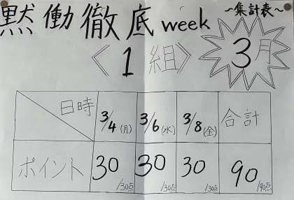 11月から始まった「黙動徹底week」が先週で終了しました。班長はどうしたら徹底できるのか考え、班員に呼び掛けることで、黙々と清掃に取り組む習慣が身に付きました。