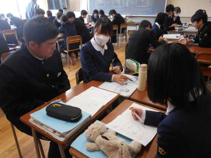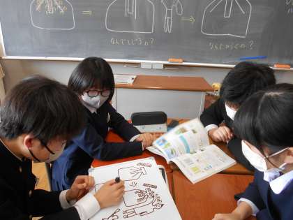 理科の授業では、グループごとに、出題された現象が起こる理由を説明することに取り組みました。みんな悪戦苦闘していましたが合格できたのでしょうか。