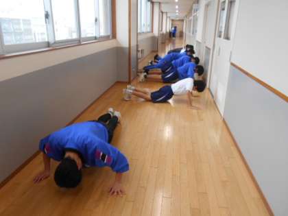 男子ソフトテニス部も校舎内で筋力トレーニングに取り組んでおり、ちょうど腕立て伏せをしていました。明日も頑張りましょう。
