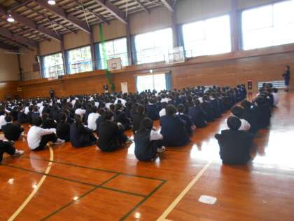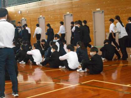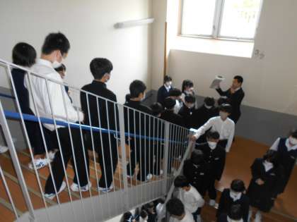 中学生になって、初めての避難訓練を行いました。説明をしっかりと聞き、静かに避難することができました。
