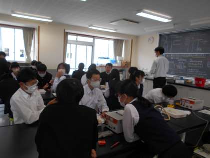 理科の授業では、理科室で水の電気分解の実験を行っていました。たくさんの保護者が見守られる中でも、落ち着いて実験ができていました。