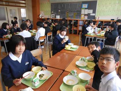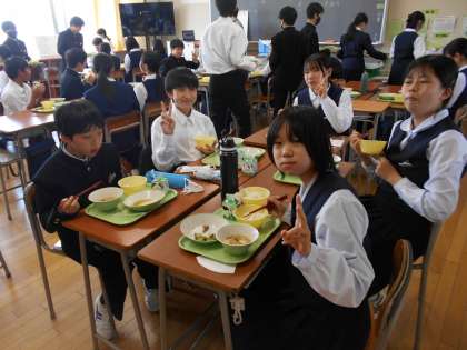 どのクラスもクラスメイトと楽しく会話をしながら給食を食べています。