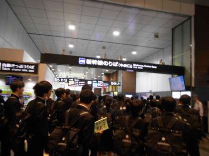 雨模様の肌寒い日となりましたが、3年生は6時21分発の新幹線に乗車し、2泊3日の修学旅行に出発しました。初日の今日は、特急と新幹線を乗り継ぎながら、一路広島に向かいます。