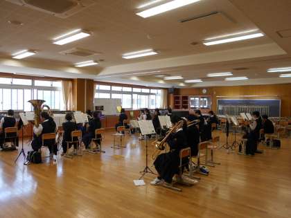 音楽室では、吹奏楽部が基礎練習中でした。担当楽器ごとに後輩に指導する姿も見られました。(写真左)