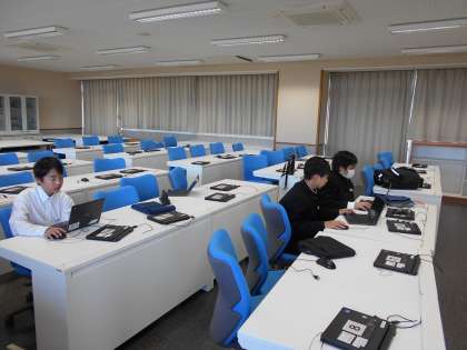 コンピュータ室では、コンピュータ・サイエンス部の1年生が活動していました。先輩たちは、部活動紹介用の撮影に出ているとのことでした。(写真右)