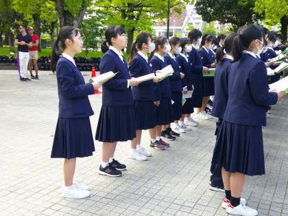 平和の集いでは、千羽鶴を奉納し、南中平和宣言を行いました。また、被災地の復興を応援するテーマソングとしてつくられた「花は咲く」をみんなで歌いました。戦争の悲惨さを知り、平和について考える機会となりました。