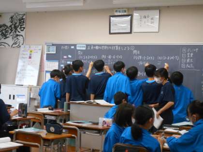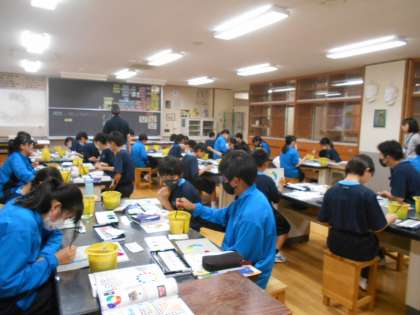 美術、数学の様子です。数学は、練習問題の計算過程を黒板に書きに来ています。