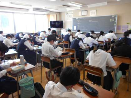 講師の先生をお招きし、ネットトラブルが起きてしまう原因や、トラブルに巻き込まれないようにするためにはどのようにすればようかなど、詳しい事例を交えながらお話いただきました。身近なスマートフォンとの向き合い方、正しい使い方を学ぶことができ、講演後の振り返りを一生懸命記入する姿が見られました。