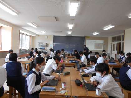 数学、技術・家庭(技術分野)の様子です。技術は栽培の学習で、ペットボトルのような容器でイチゴ栽培に取り組むようです。