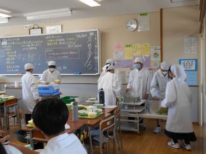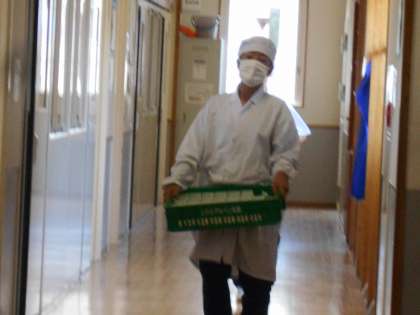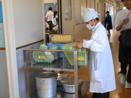 給食準備の様子です。エプロンの用意ができた給食当番から食器や食缶を準備します。牛乳は1階の給食室まで係が取りに行きます。