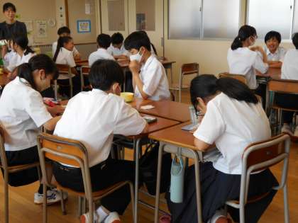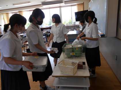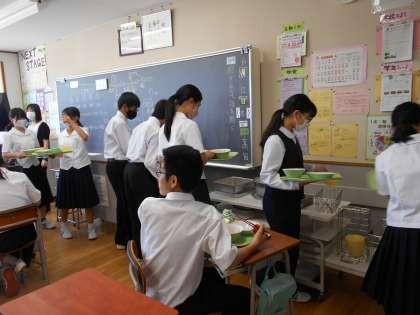 時間を決めて食べ終わった生徒から食器の片付けを行います。列を作って順番を守って片づけています。食器の片付けが終わった生徒は席に座って過ごすことになっています。ごちそうさまの挨拶のあと、当番が給食室まで食器かごや食缶を運びます。