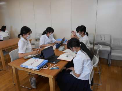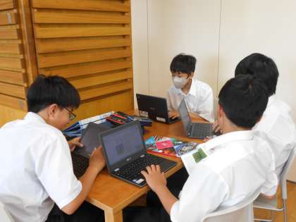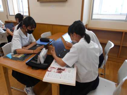 図書室を学級ごとにローテーションで利用し総合的な学習の時間の調べ学習を進めています。写真は5組の生徒が図書室の本やクロムブックを使って多目的室で学習している様子です。