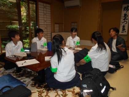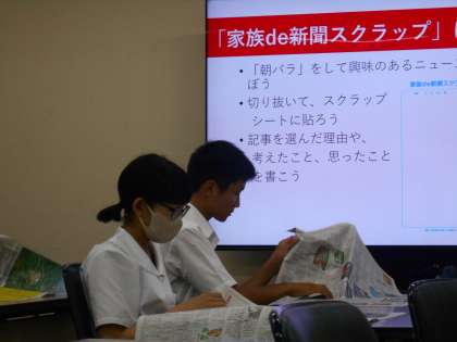 新聞スクラップ作りのために、真剣に話を聞いています。質問にも積極的に答えていました。