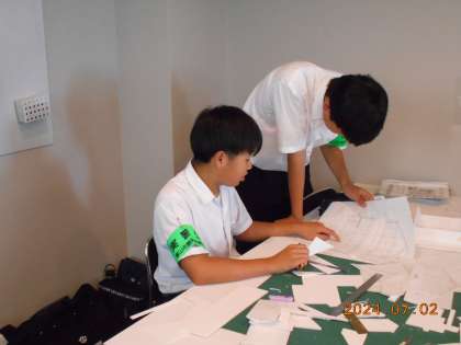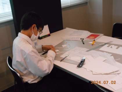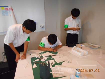 生徒からは、「切ったものをくみ上げて形になっていくのは楽しい。」「平面図や建築図面は初めて目にしました。」「細部とカットや組み立てが難しい。手先の器用さが必要です。」「普段はハサミに慣れているので、カッターの使い方が難しくて大変です。」と、体験の中で感じたことへの率直な言葉を聞くことができました。